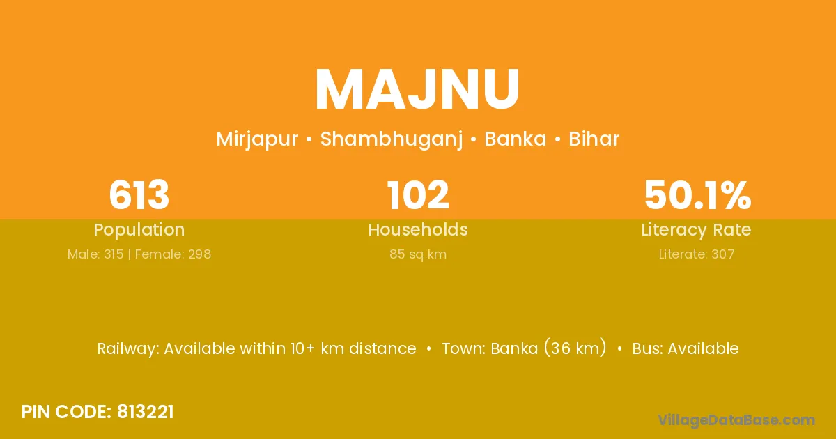 Banka (36 km) is the nearest town to Majnu village for major economic activities and is located approximately 36 km away.