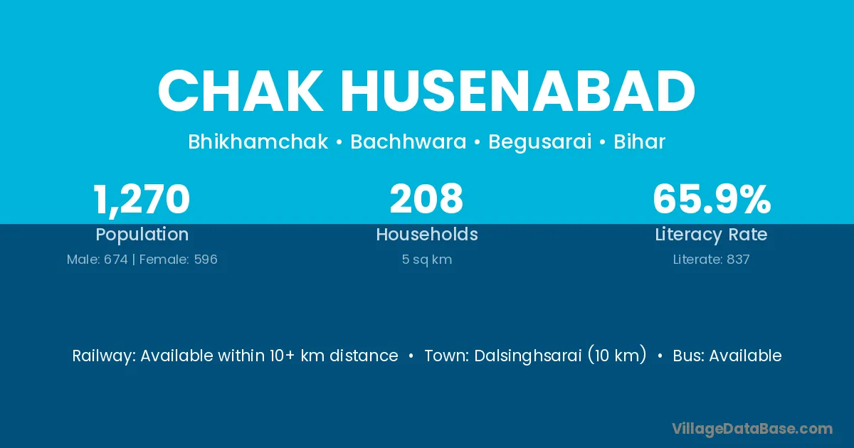 Dalsinghsarai (10 km) is the nearest town to Chak Husenabad village for major economic activities and is located approximately 10 km away.