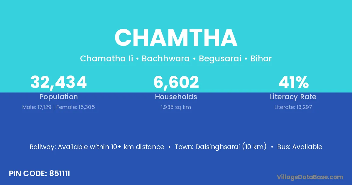 Dalsinghsarai (10 km) is the nearest town to Chamtha village for major economic activities and is located approximately 10 km away.