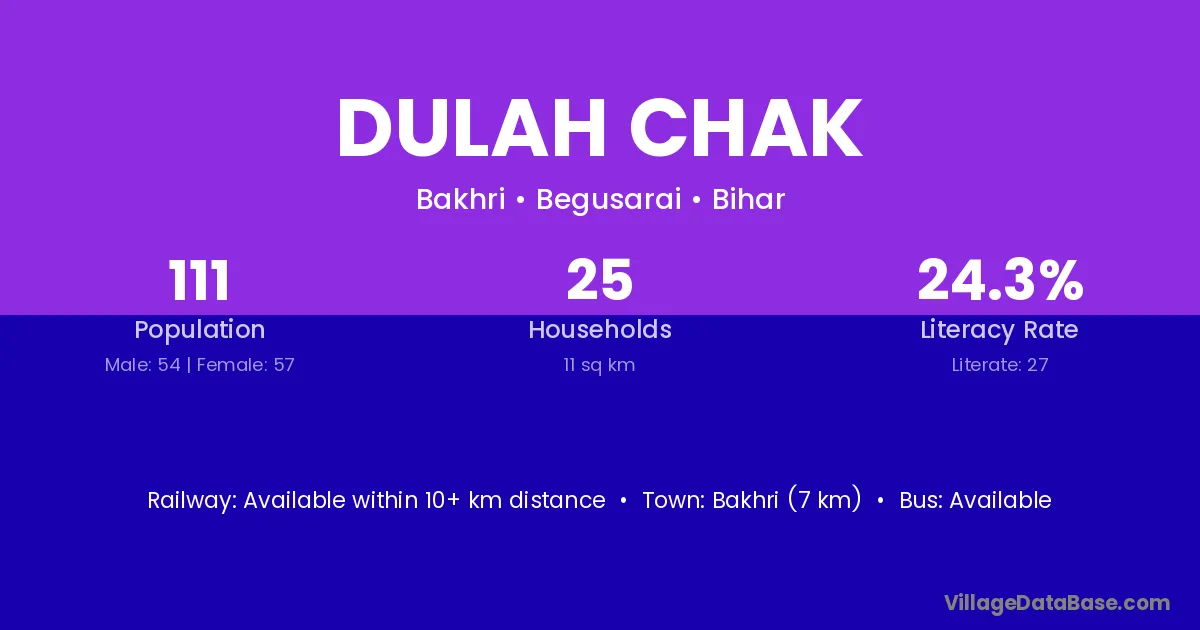 Bakhri (7 km) is the nearest town to Dulah Chak village for major economic activities and is located approximately 7 km away.