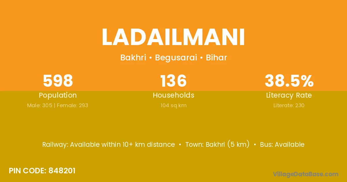 Bakhri (5 km) is the nearest town to Ladailmani village for major economic activities and is located approximately 5 km away.