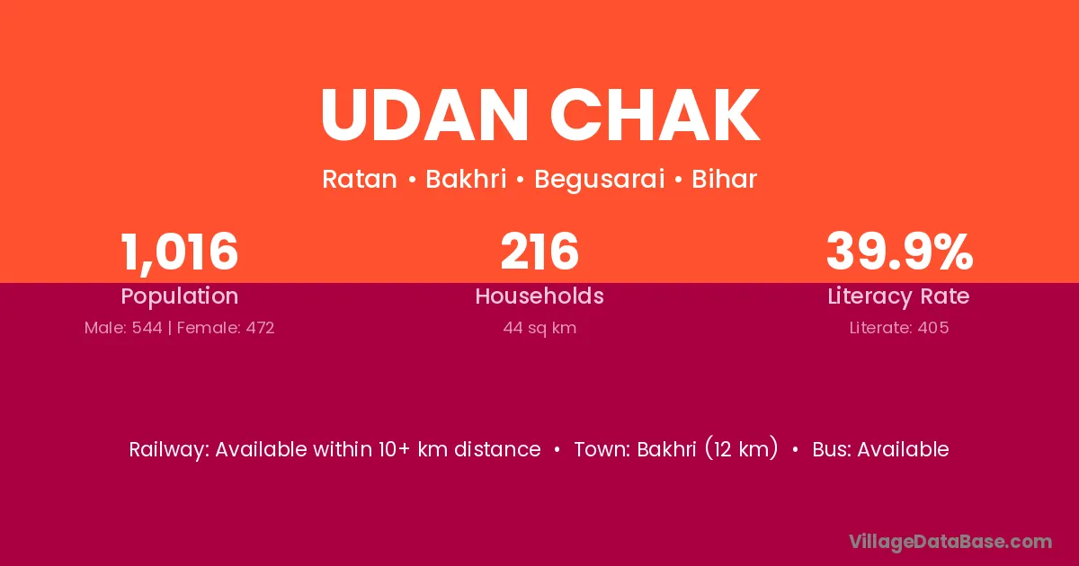 Udan Chak village has a total population of 1,016 people, of which 544 are males and 472 are females.