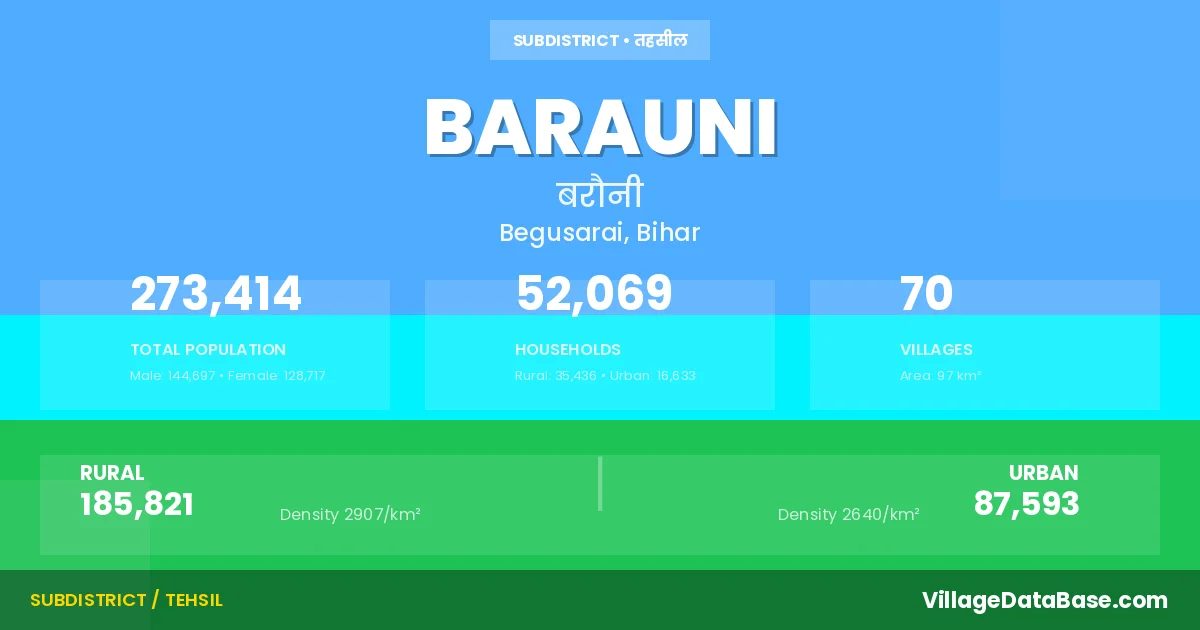 According to the 2011 census The total area of Barauni Subdivision is 97 km², with a population of 273414 people. The population density is 2,816 inhabitants per square kilometre, and there are approximately 52069 houses in the sub district.
