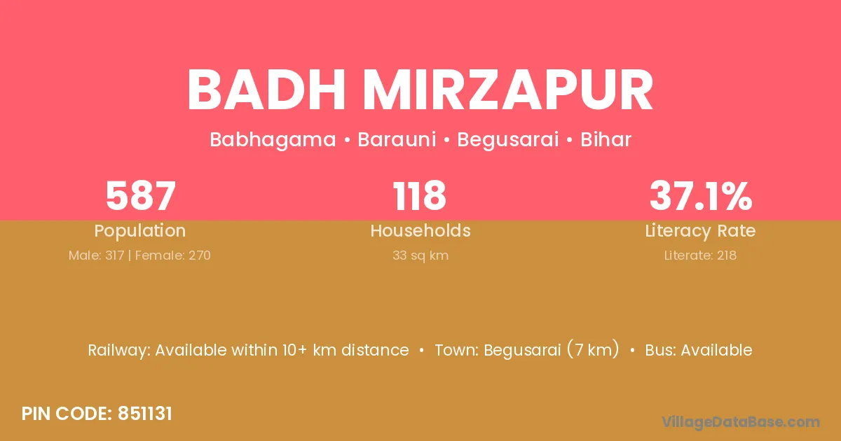 Begusarai (7 km) is the nearest town to Badh Mirzapur village for major economic activities and is located approximately 7 km away.