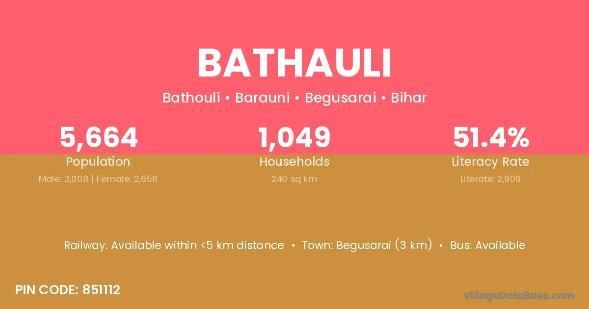 Begusarai (3 km) is the nearest town to Bathauli village for major economic activities and is located approximately 3 km away.