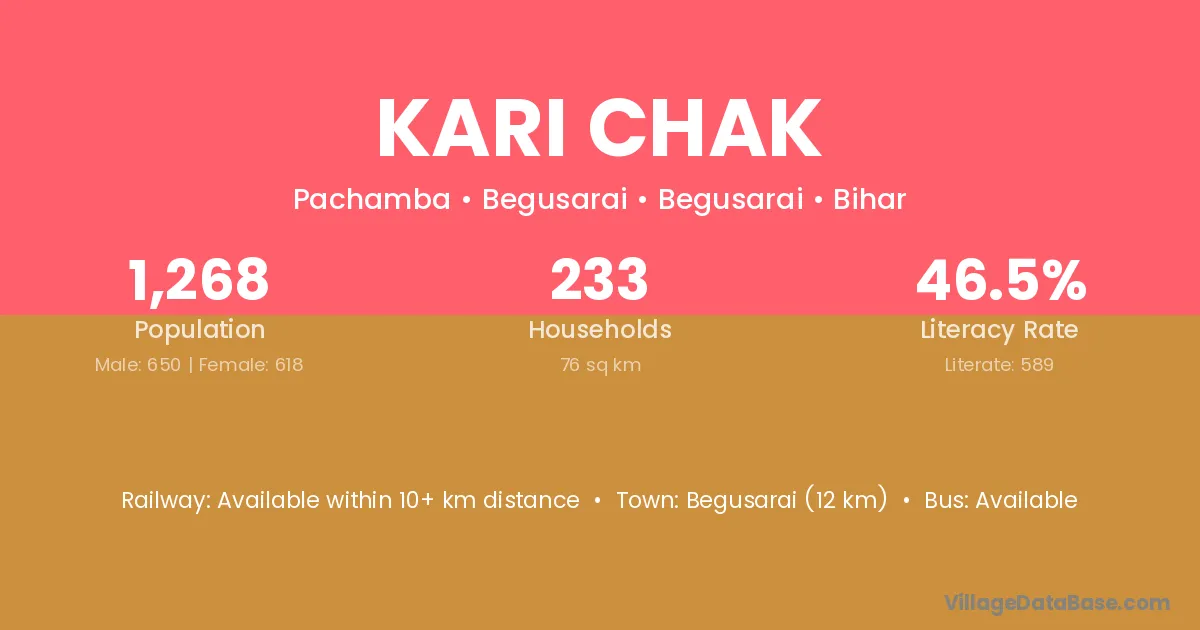 Begusarai (12 km) is the nearest town to Kari Chak village for major economic activities and is located approximately 12 km away.