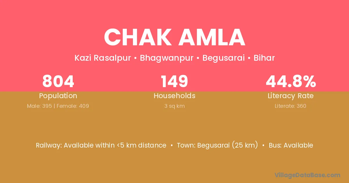 Begusarai (25 km) is the nearest town to Chak Amla village for major economic activities and is located approximately 25 km away.