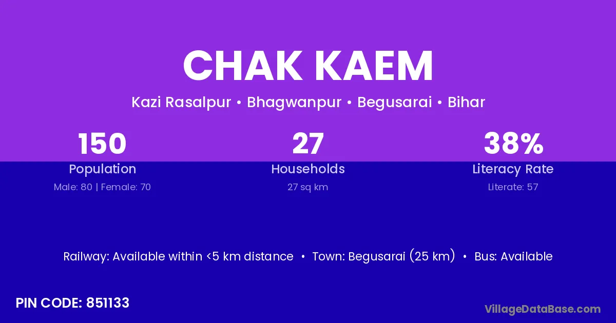 Begusarai (25 km) is the nearest town to Chak Kaem village for major economic activities and is located approximately 25 km away.
