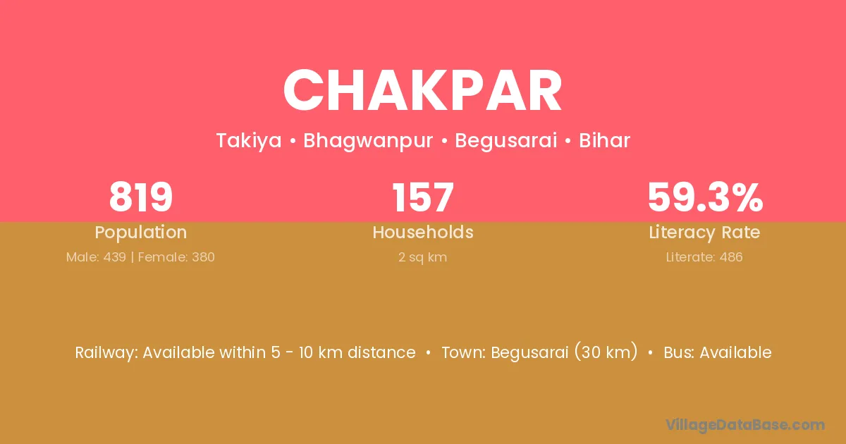 Begusarai (30 km) is the nearest town to Chakpar village for major economic activities and is located approximately 30 km away.