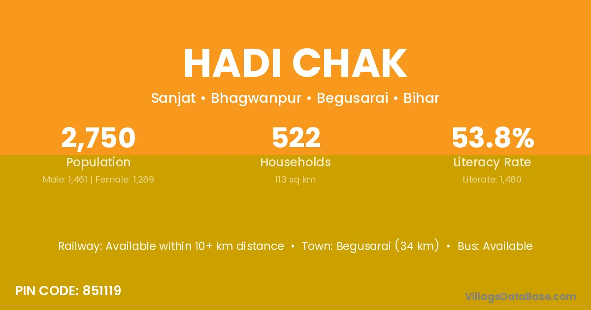 Begusarai (34 km) is the nearest town to Hadi Chak village for major economic activities and is located approximately 34 km away.