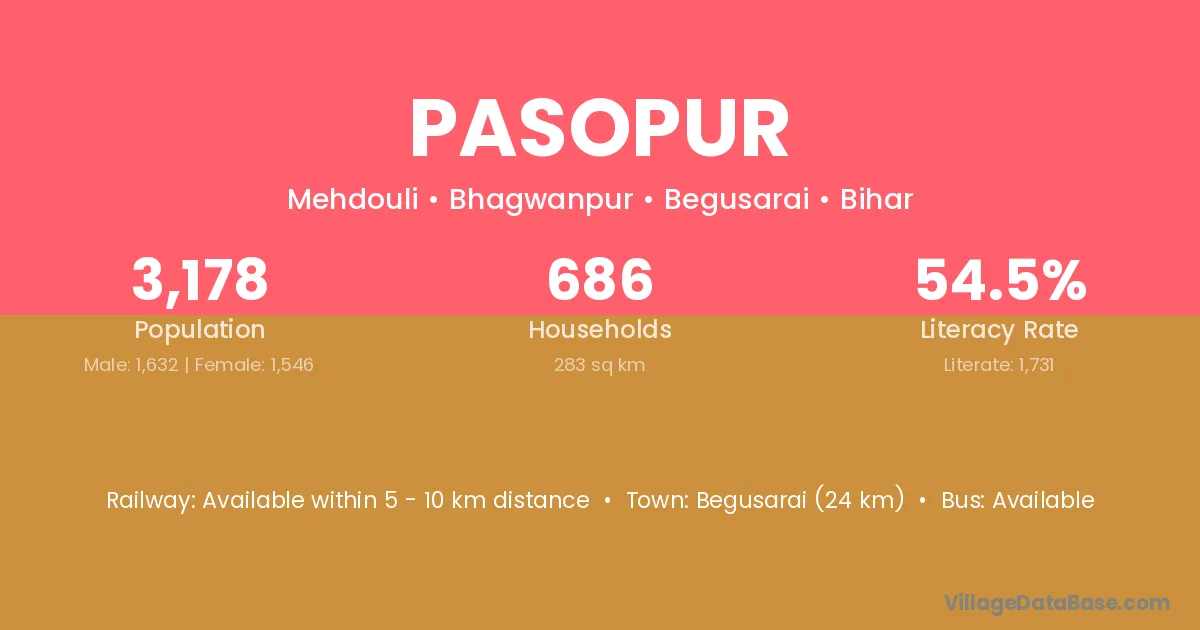Begusarai (24 km) is the nearest town to Pasopur village for major economic activities and is located approximately 24 km away.