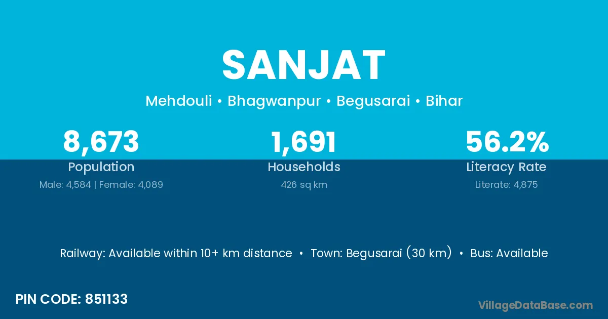 Begusarai (30 km) is the nearest town to Sanjat village for major economic activities and is located approximately 30 km away.