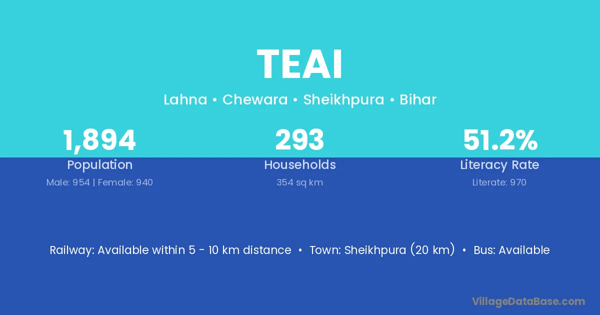 Begusarai (30 km) is the nearest town to Teai village for major economic activities and is located approximately 30 km away.