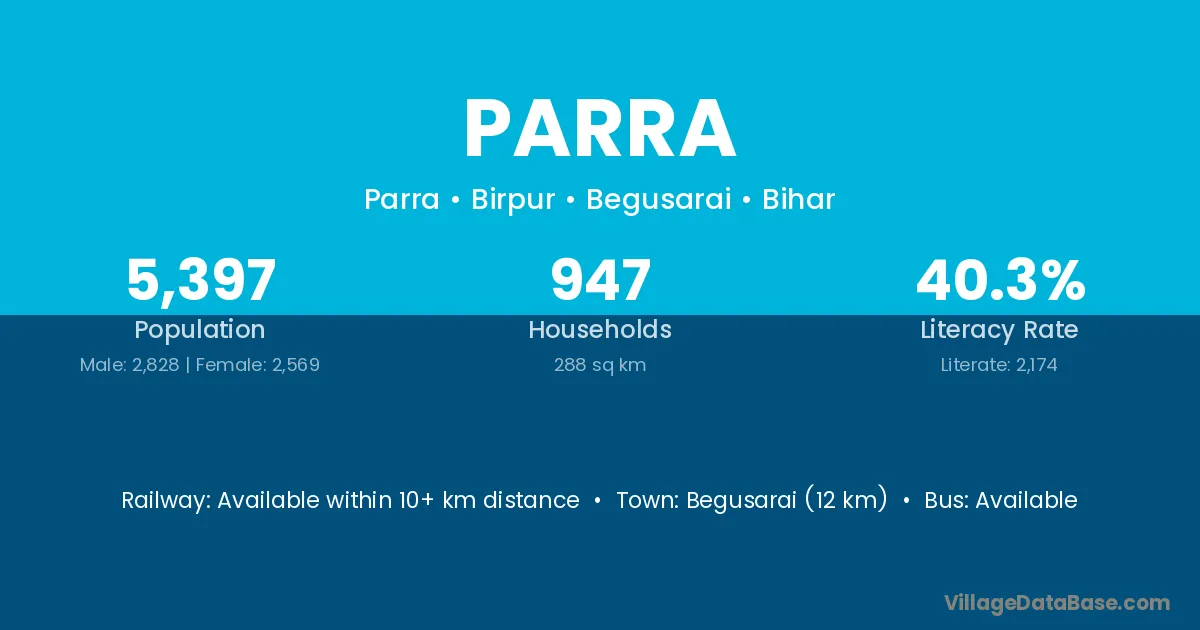 Begusarai (12 km) is the nearest town to Parra village for major economic activities and is located approximately 12 km away.
