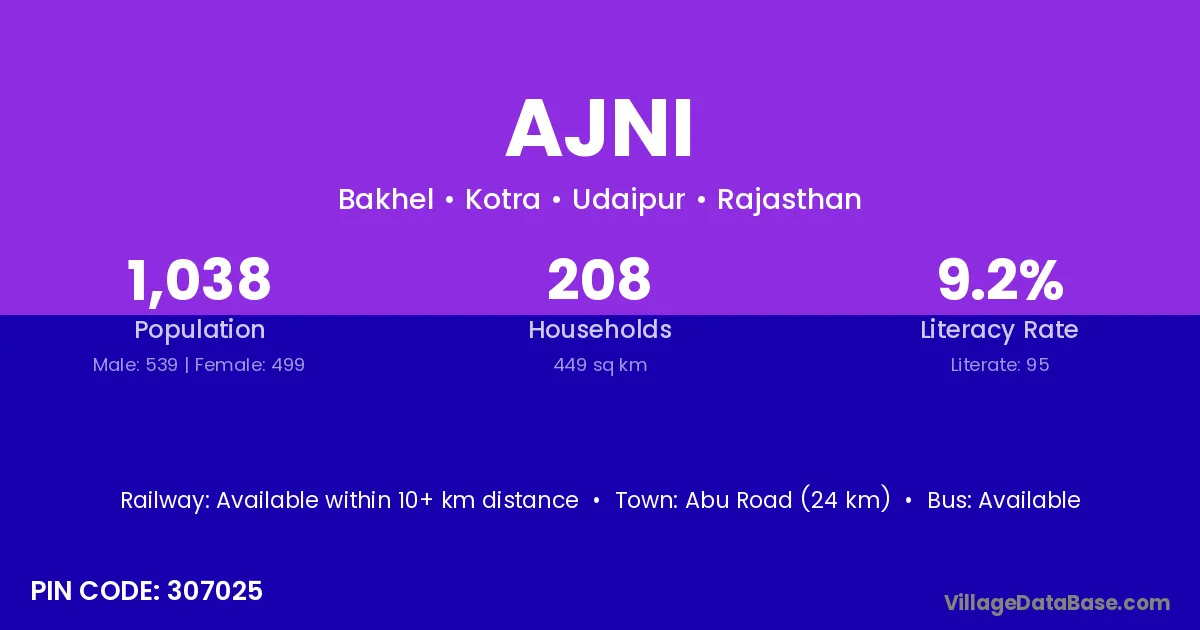 The literacy rate of Ajni village is 50.25%. Male literacy stands at 58.41% and female literacy at 41.48%.