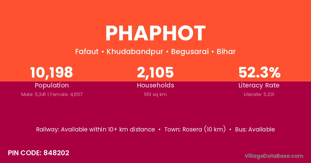 Phaphot village has a total population of 10,198 people, of which 5,341 are males and 4,857 are females.