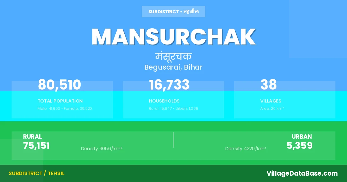 Mansurchak is a town and Subdivision in the Begusarai district of the Bihar. In India, a Subdivision is a subdivision of a district responsible for the administration and revenue collection of a specific area within the district. Subdivisions play a crucial role in the local governance structure, contributing significantly to the development and administration of their communities.