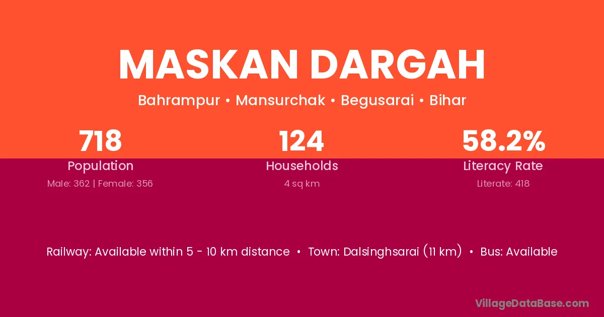 Maskan Dargah village has a total population of 718 people, of which 362 are males and 356 are females.