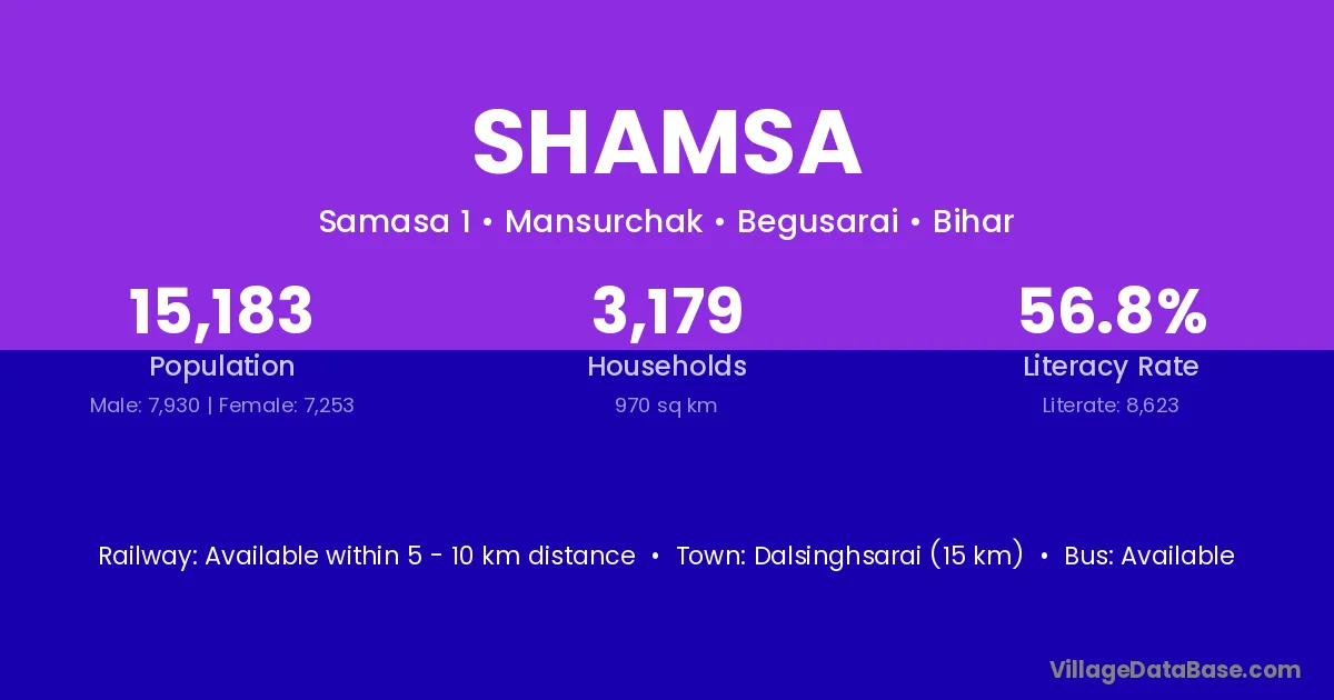 Dalsinghsarai (15 km) is the nearest town to Shamsa village for major economic activities and is located approximately 15 km away.