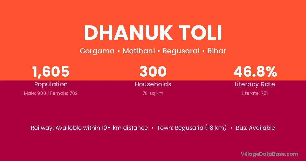 Begusaria (18 km) is the nearest town to Dhanuk Toli village for major economic activities and is located approximately 18 km away.