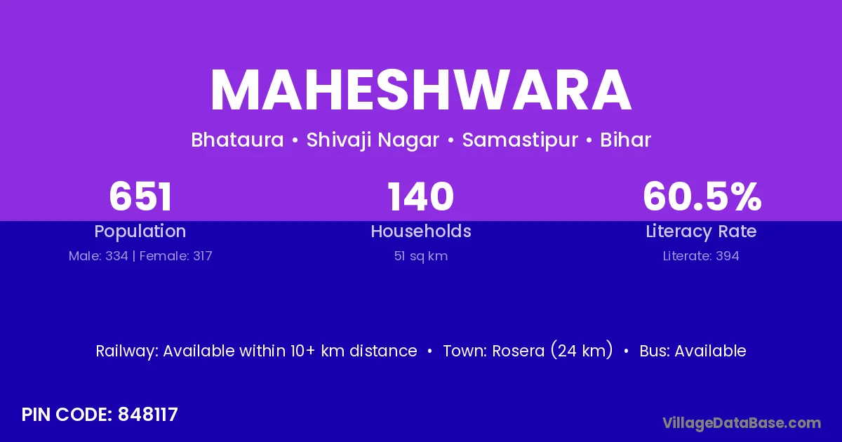 Begusarai (17 km) is the nearest town to Maheshwara village for major economic activities and is located approximately 17 km away.