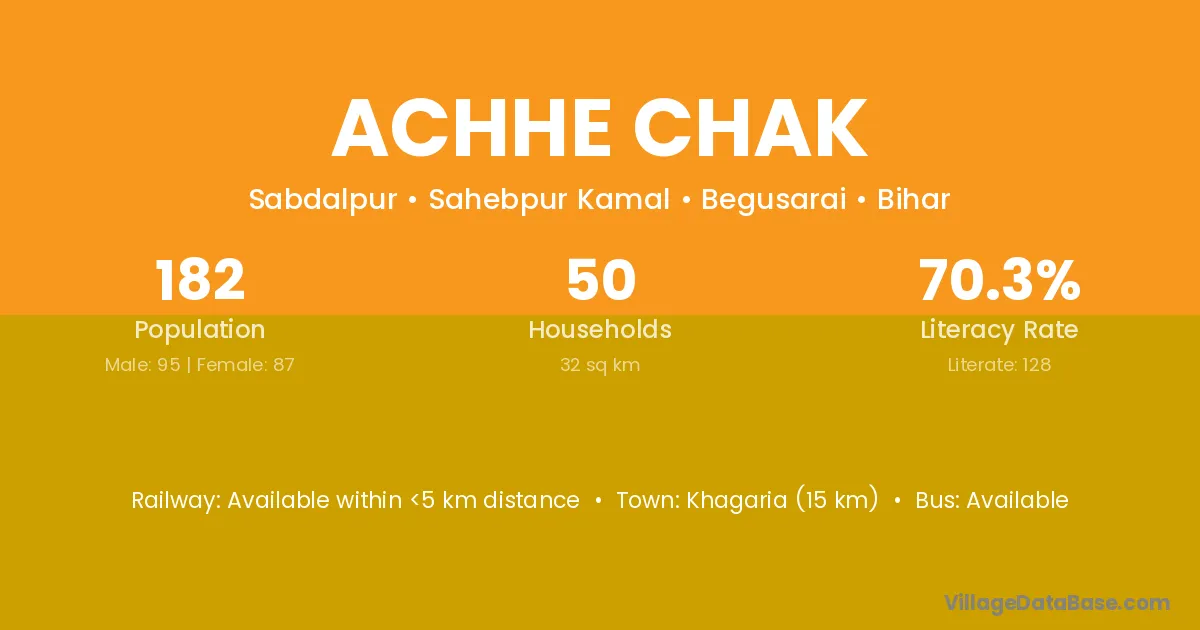 Khagaria (15 km) is the nearest town to Achhe Chak village for major economic activities and is located approximately 15 km away.