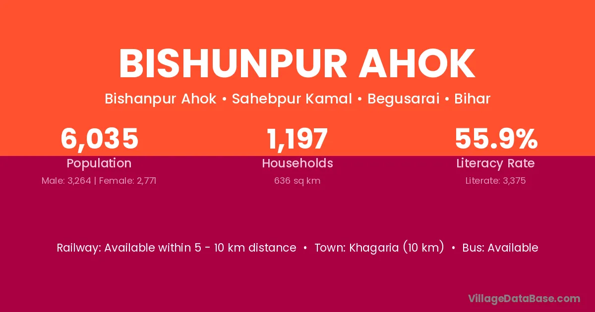 Bishunpur Ahok village has a total population of 6,035 people, of which 3,264 are males and 2,771 are females.