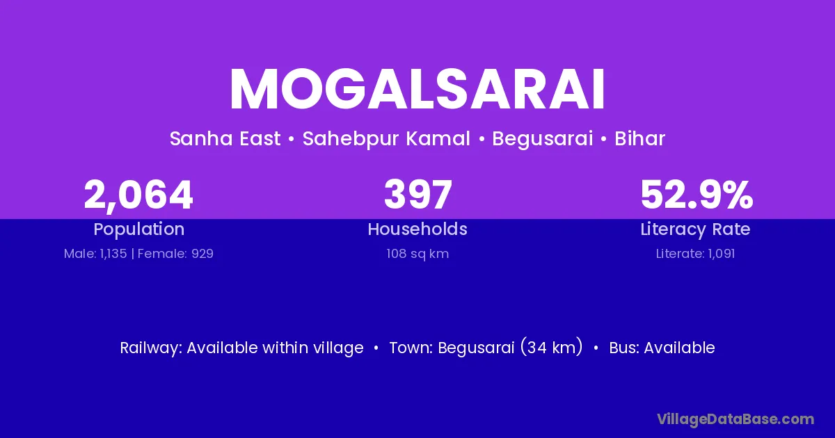 Begusarai (34 km) is the nearest town to Mogalsarai village for major economic activities and is located approximately 34 km away.