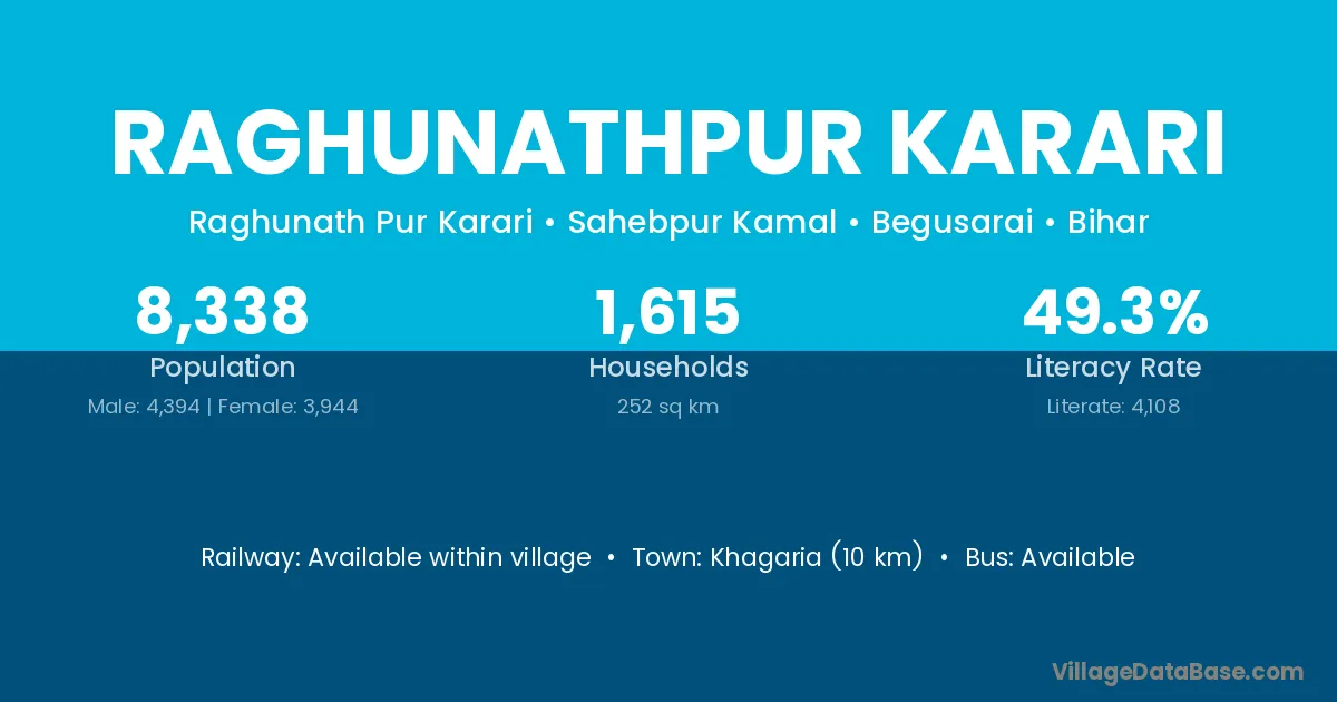Khagaria (10 km) is the nearest town to Raghunathpur Karari village for major economic activities and is located approximately 10 km away.