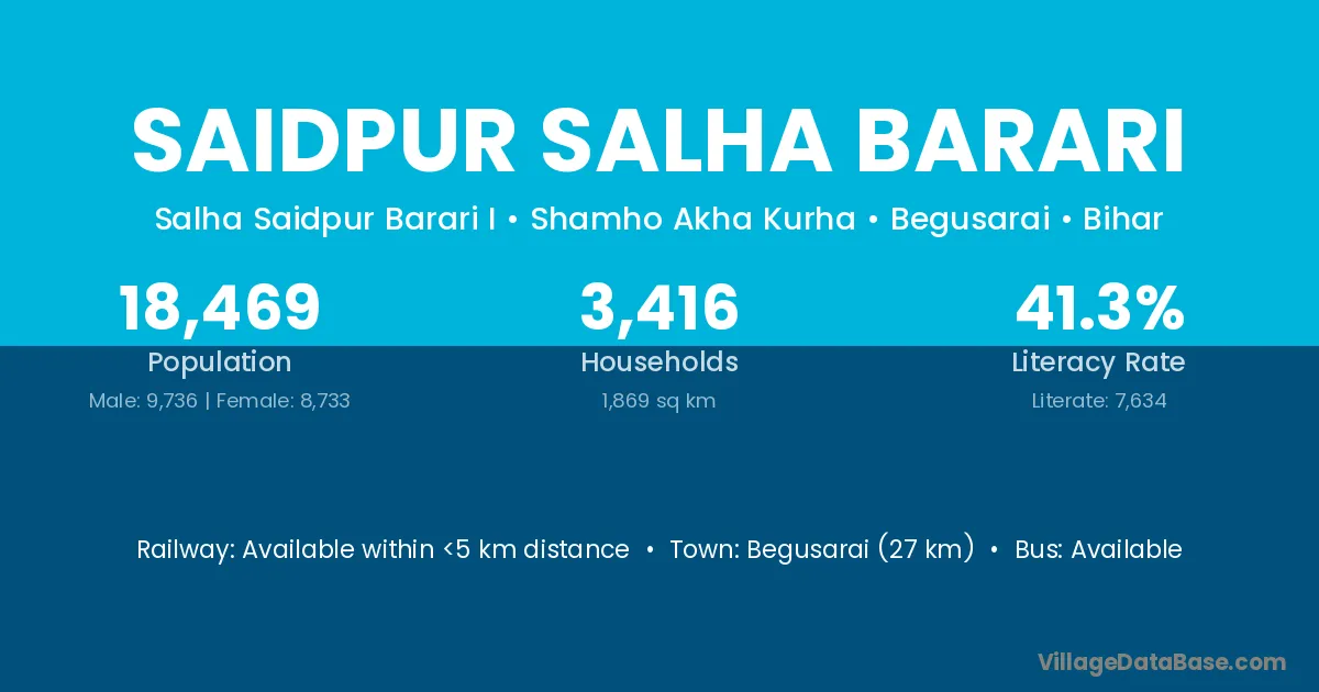 Begusarai (27 km) is the nearest town to Saidpur Salha Barari village for major economic activities and is located approximately 27 km away.