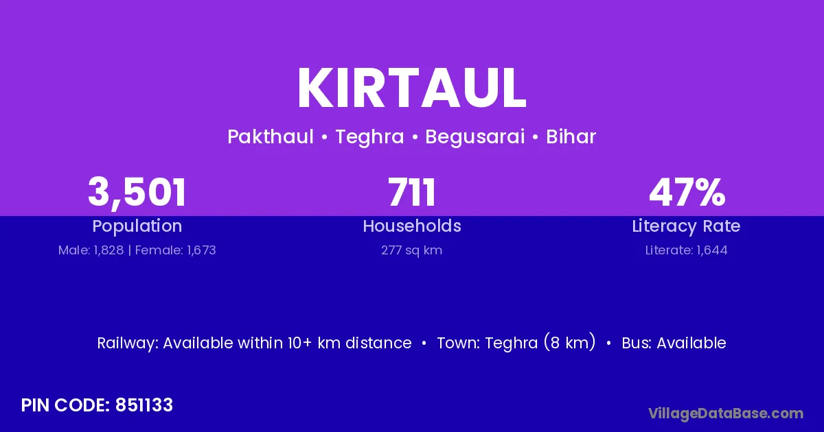Teghra (8 km) is the nearest town to Kirtaul village for major economic activities and is located approximately 8 km away.