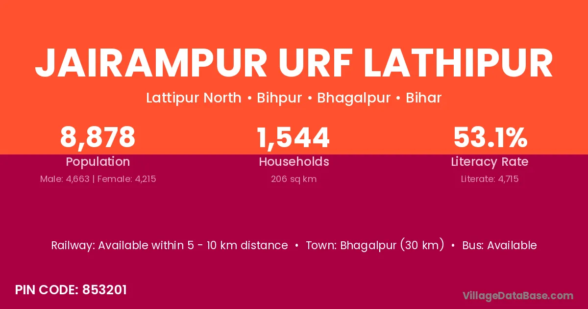 Bhagalpur (30 km) is the nearest town to Jairampur Urf Lathipur village for major economic activities and is located approximately 30 km away.