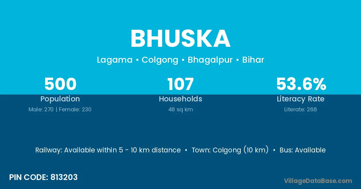 Colgong (10 km) is the nearest town to Bhuska village for major economic activities and is located approximately 10 km away.