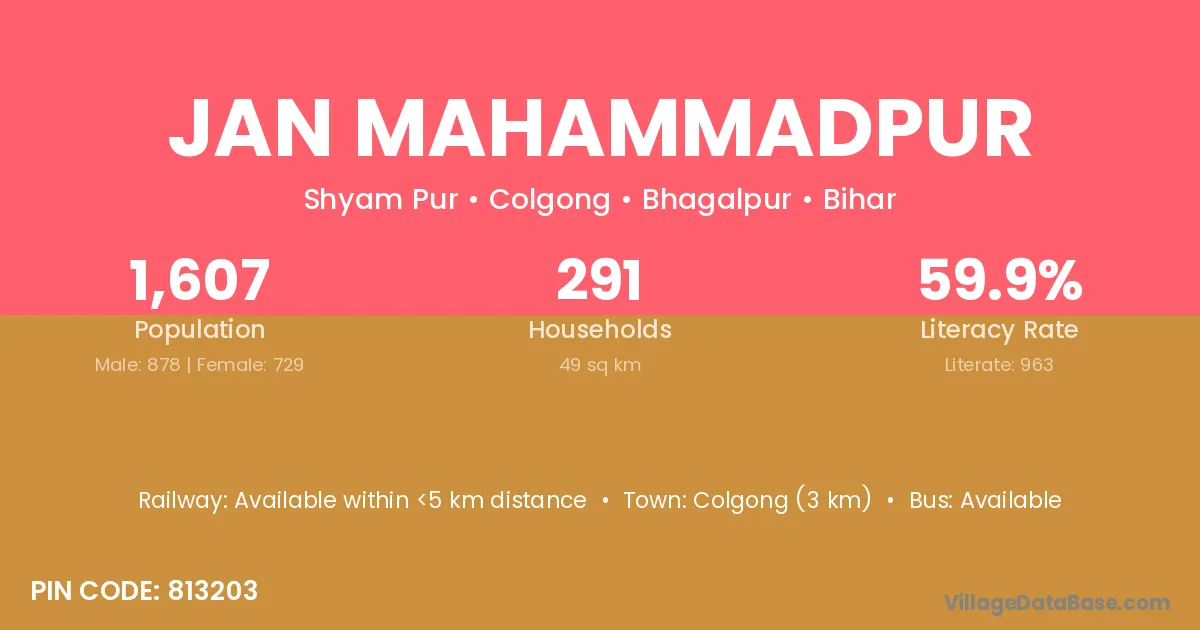 Colgong (3 km) is the nearest town to Jan Mahammadpur village for major economic activities and is located approximately 3 km away.