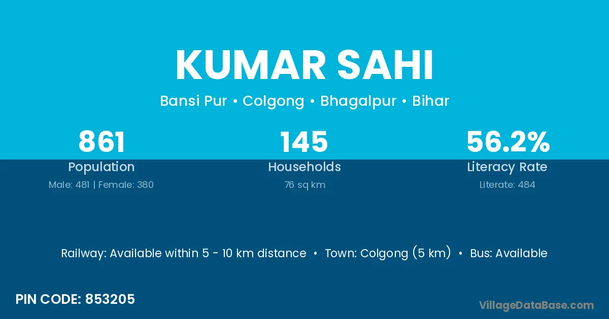 Colgong (5 km) is the nearest town to Kumar Sahi village for major economic activities and is located approximately 5 km away.