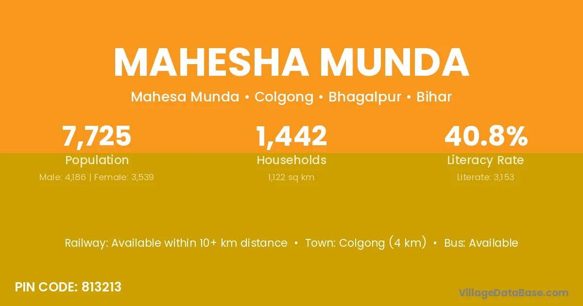 Colgong (4 km) is the nearest town to Mahesha Munda village for major economic activities and is located approximately 4 km away.
