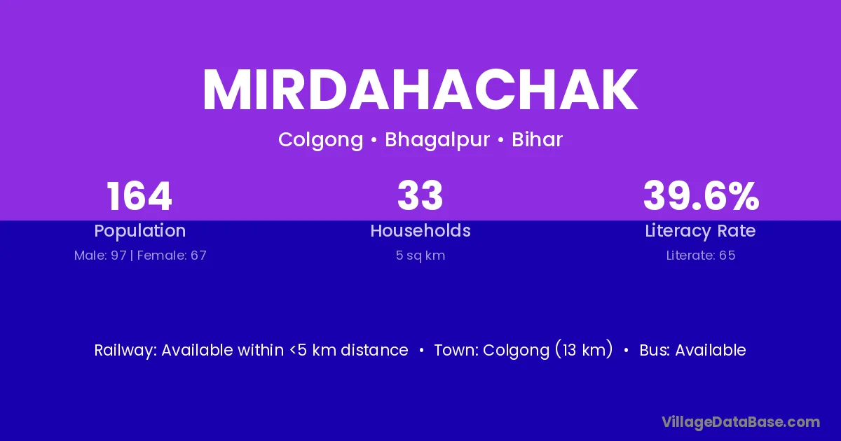 Colgong (13 km) is the nearest town to Mirdahachak village for major economic activities and is located approximately 13 km away.
