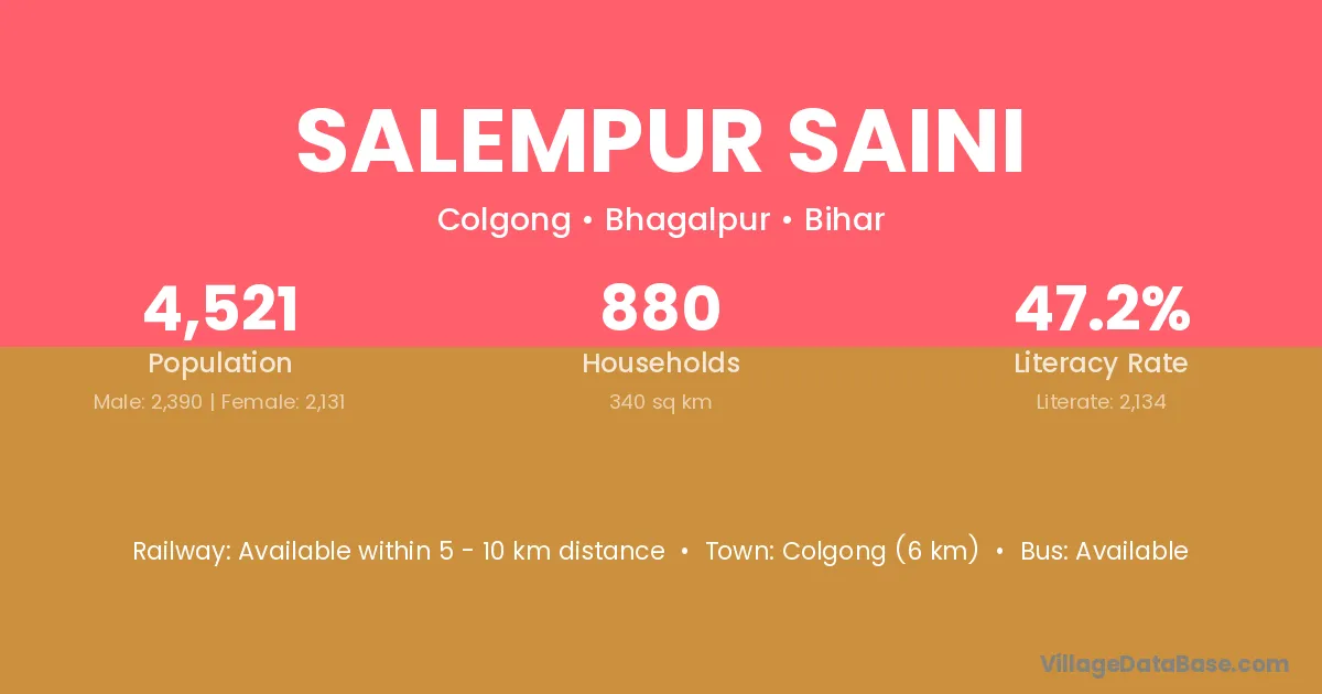 Colgong (6 km) is the nearest town to Salempur Saini village for major economic activities and is located approximately 6 km away.