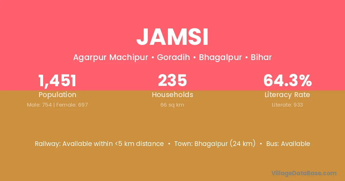 Bhagalpur (24 km) is the nearest town to Jamsi village for major economic activities and is located approximately 24 km away.