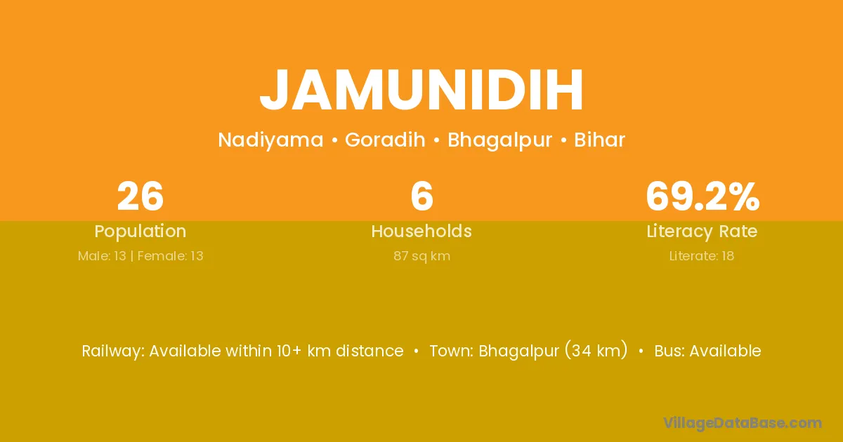 Bhagalpur (34 km) is the nearest town to Jamunidih village for major economic activities and is located approximately 34 km away.