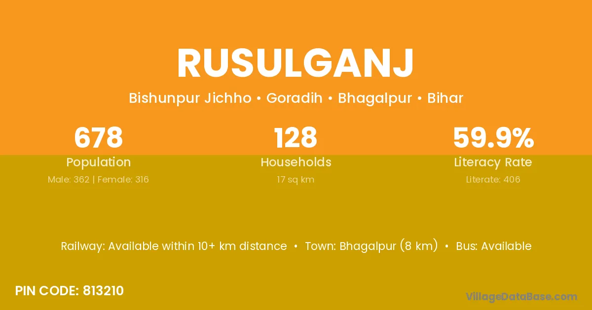Bhagalpur (8 km) is the nearest town to Rusulganj village for major economic activities and is located approximately 8 km away.