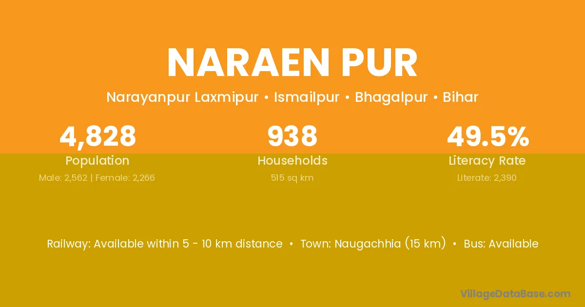 Naugachhia (15 km) is the nearest town to Naraen Pur village for major economic activities and is located approximately 15 km away.