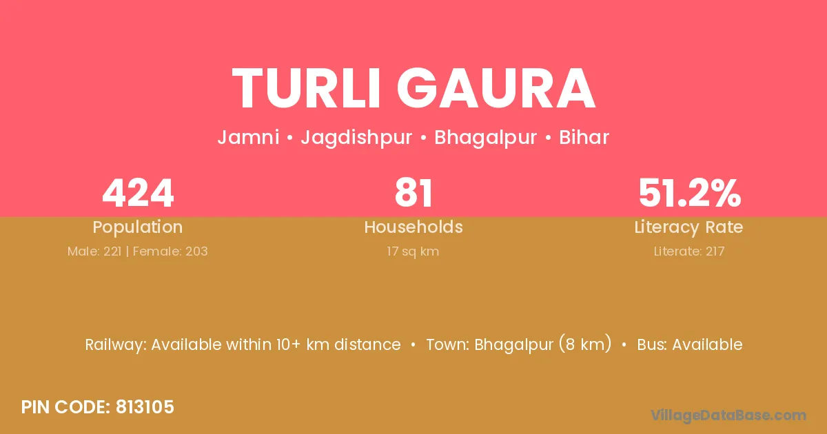 Bhagalpur (8 km) is the nearest town to Turli Gaura village for major economic activities and is located approximately 8 km away.