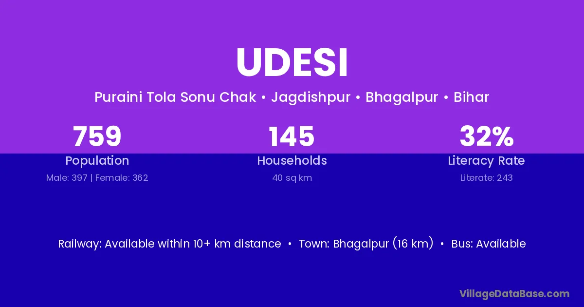 Bhagalpur (16 km) is the nearest town to Udesi village for major economic activities and is located approximately 16 km away.