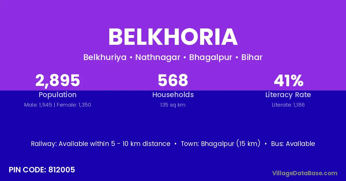 Bhagalpur (15 km) is the nearest town to Belkhoria village for major economic activities and is located approximately 15 km away.