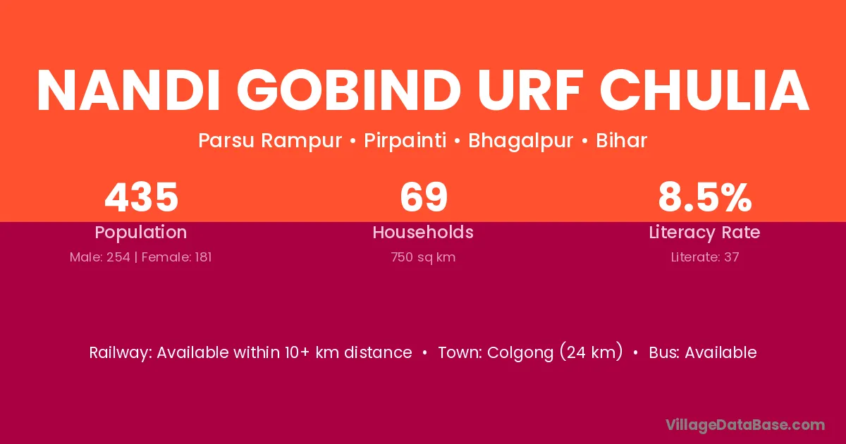 Colgong (24 km) is the nearest town to Nandi Gobind Urf Chulia village for major economic activities and is located approximately 24 km away.