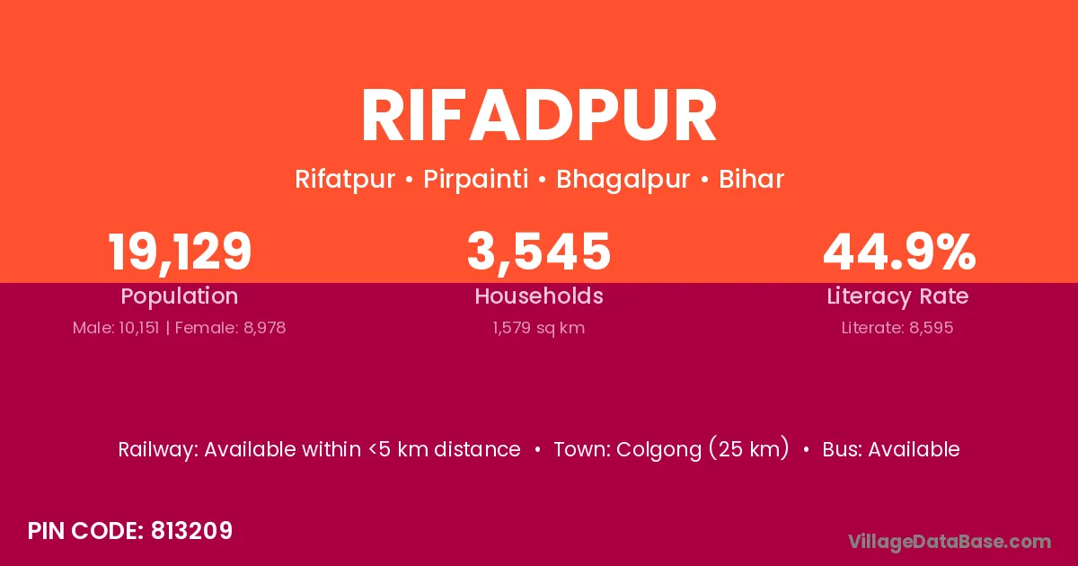Colgong (25 km) is the nearest town to Rifadpur village for major economic activities and is located approximately 25 km away.