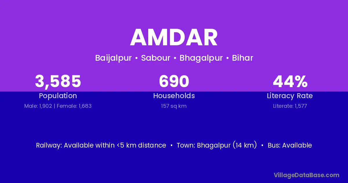 Bhagalpur (14 km) is the nearest town to Amdar village for major economic activities and is located approximately 14 km away.