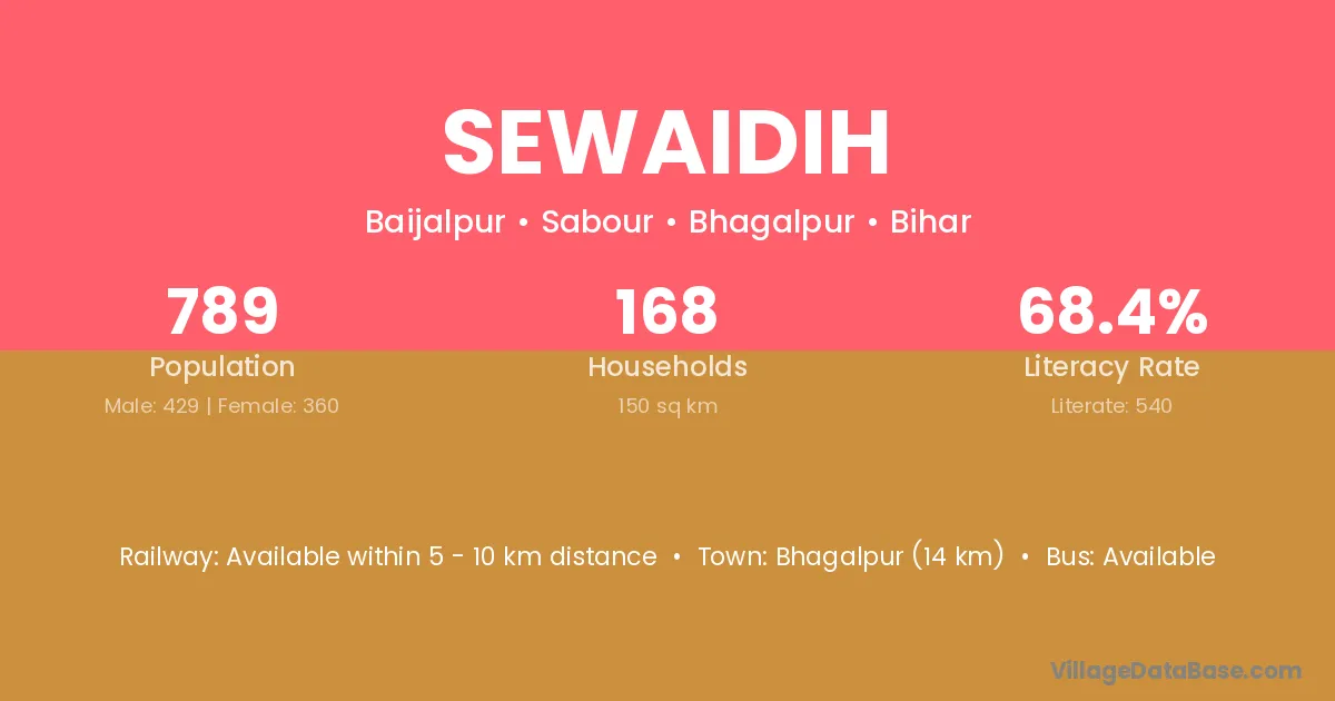 Bhagalpur (14 km) is the nearest town to Sewaidih village for major economic activities and is located approximately 14 km away.
