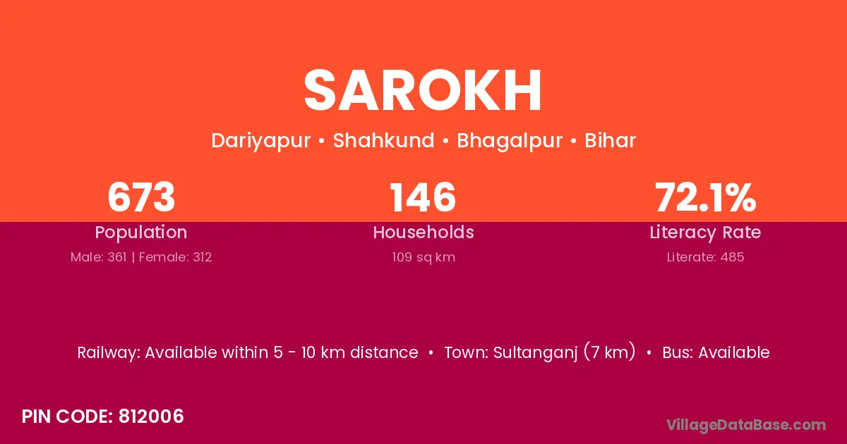 Sultanganj (7 km) is the nearest town to Sarokh village for major economic activities and is located approximately 7 km away.